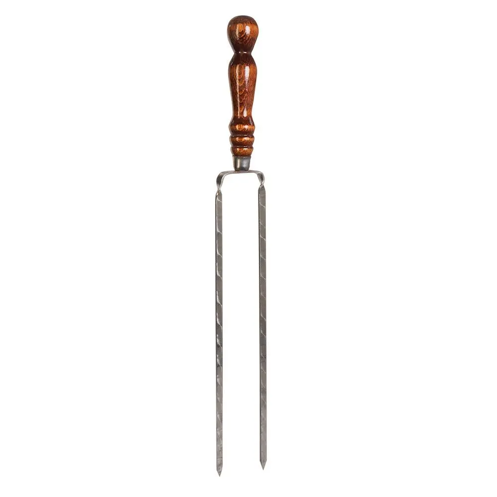 Шампур двойной с деревянной ручкой – предмет, который прекрасно подходит для приготовления тушки птицы или стейков на даче или на пикнике за городом. Такой шампур обеспечивает двойную фиксацию нанизанных кусочков. Деревянная ручка делает шампур лёгким, не нагревается, покрыта защитным лаком и её приятно держать в руке.