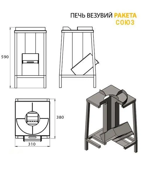 Печь ракетная Ракета Союз Ракетная печь Везувий Ракета Союз – приспособление для готовки на открытом огне. Конструкция этой печи рассчитана на стационарное размещение печи на даче или садовом участке. Ракета Союз представляет собой комбинацию ракетной печи Везувий Ракета 2 и специально разработанной подставки-подстолья.