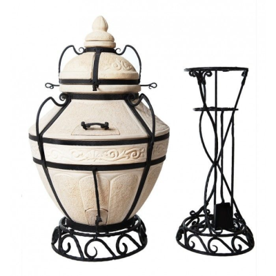 Форма напоминает амфору. Заключено изделие в кованый ажурный каркас. К печи прилагается подставка под стать изделию, и стойка для шампуров также выкованная вручную. Стоит отметить, что не ко всем моделям такой печи в комплектацию входит подобный функционал.