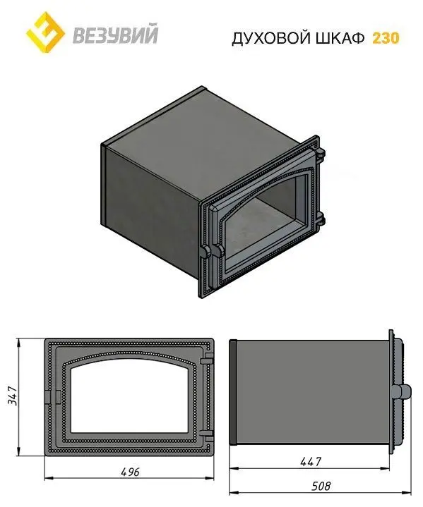Духовка фирмы Везувий представлена в цвете антрацит. Модель изготавливается из комбинации чугуна и стали, дверца выполнена из чугуна, а корпус сделан из стали. Духовой шкаф устанавливается в кирпичную печь или мангал и предназначен для приготовления и разогрева пищи.Герметичная дверка