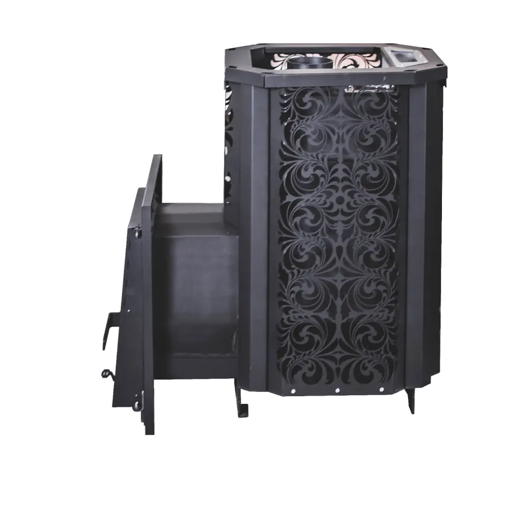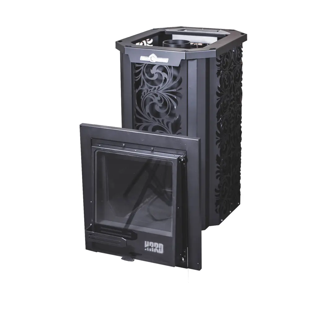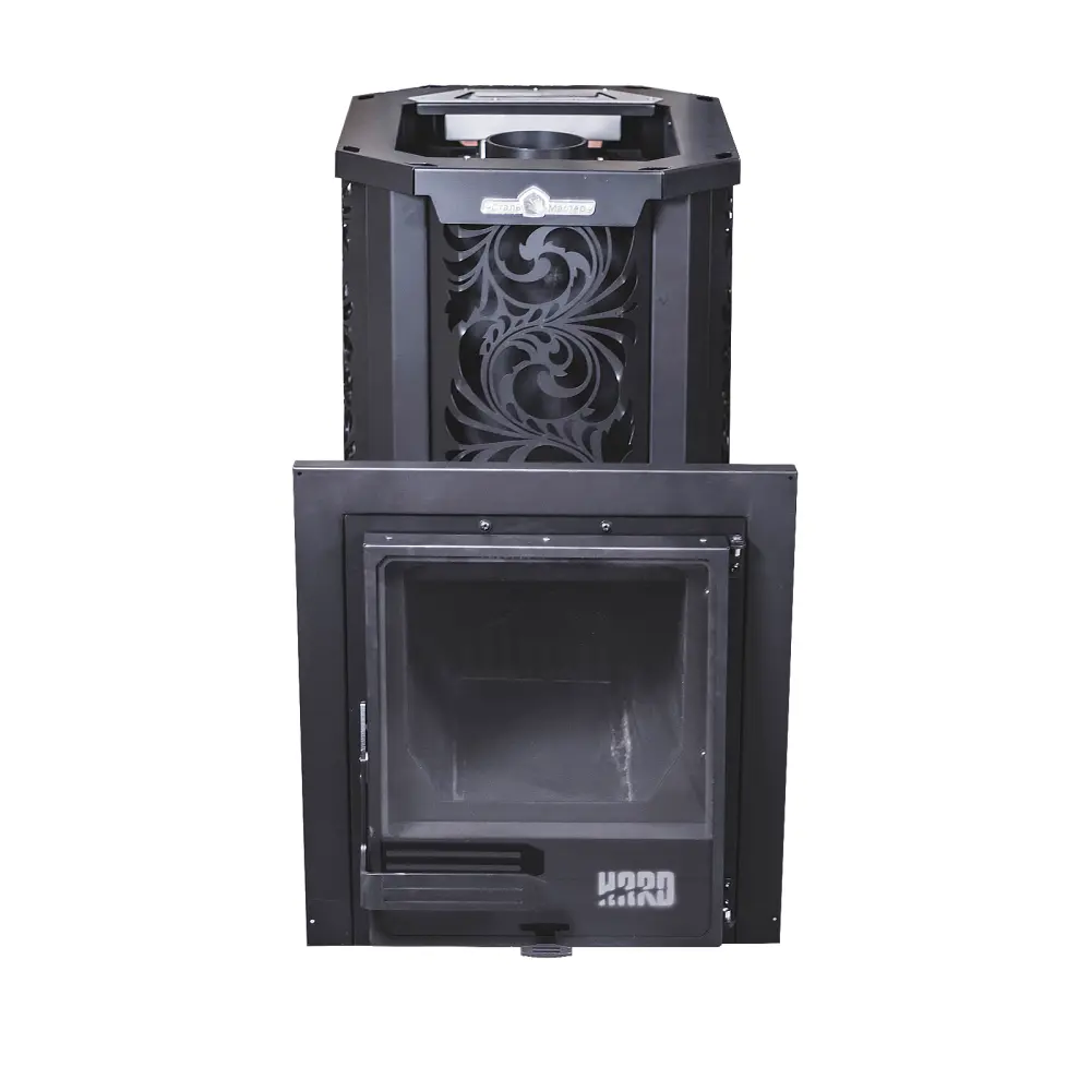Топка изготовлена из конструкционной стали 09Г2С толщиной 6 мм. Печь «HARD» Хохлома оснащена закрытой каменкой из нержавеющей стали AISI 304, толщиной 3 мм, а так же имеет увеличенную по высоте топку, что позволяет эффективнее прогревать камни в закрытой каменке и парильное помещение.