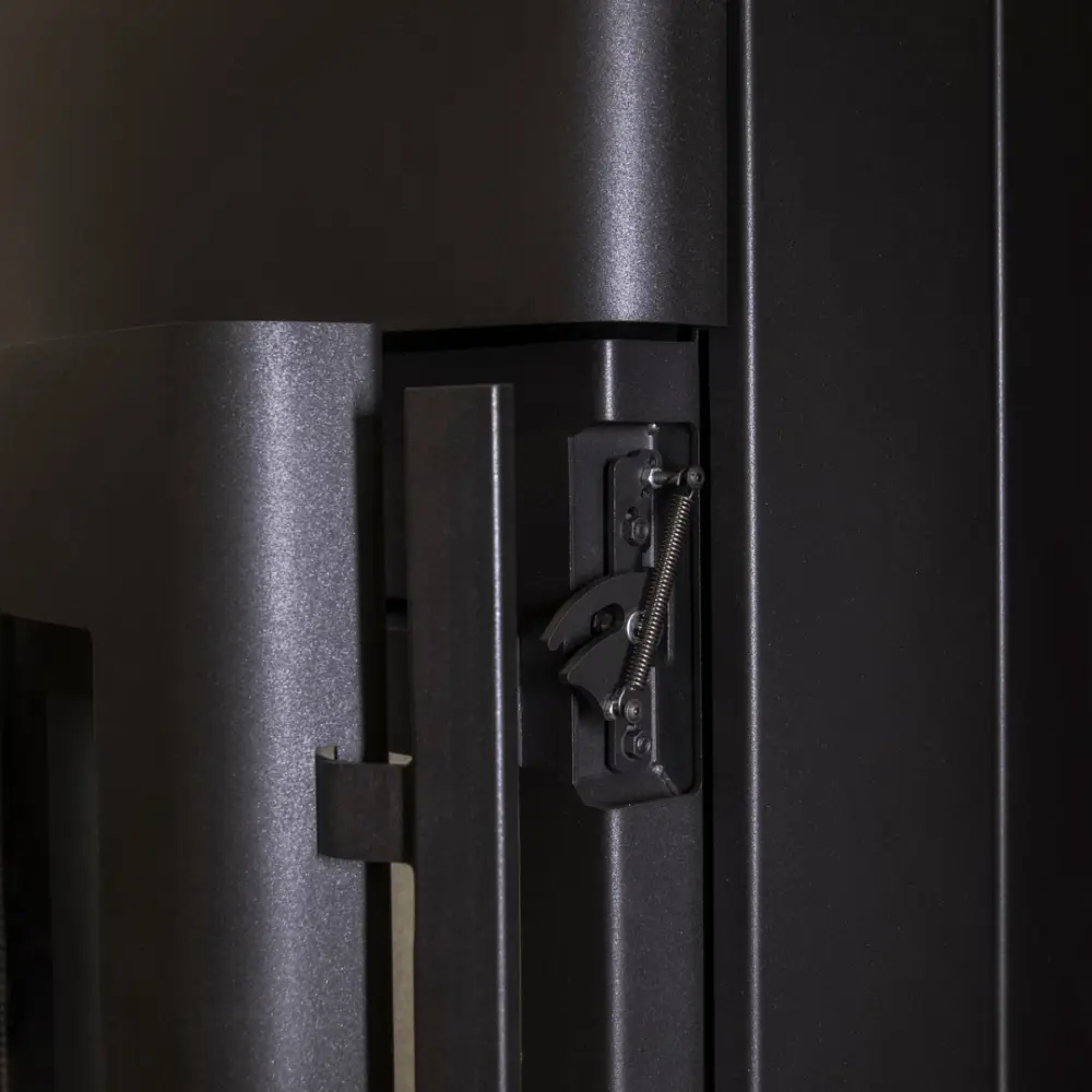Большое прямое стекло открывает отличный вид на огонь. Футеровка топки выполнена из вермикулита. Очаг с возможностью подключения притока воздуха извне. Выдвижной нижний ящик оснащен системой "Push-to-open" с направляющими. Дымоход, диаметром 150 мм, подключается сверху или сзади.