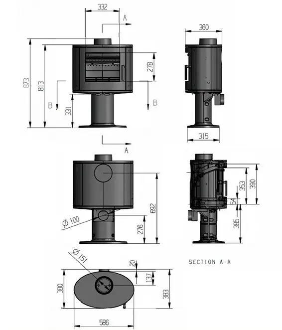 Печь-камин изготовлена из качественного жаростойкого чугуна с толщиной стенок 6-8 мм. Модель рассчитана на обогрев помещений объёмом до 180м³. Печь-камин имеет два пламегасителя: самый нагруженный пламегаситель изготовлен из жаростойкого чугуна, второй из особо прочной котловой стали 09Г2С. Топка печи-камина усилена чугунными вставками с системой двухуровневого вторичного дожига. Регулировка этой системы, как и подача воздуха в колосниковую зону, осуществляется рычагом, расположенным слева в нижней части печи-камина. В правой нижней части расположена ручка регулировки системы чистое стекло, которая помогает оставаться стеклу чистым. Патрубок дымохода Ø 150мм – универсальный, со сменным положением. Он может быть установлен сверху или сзади.