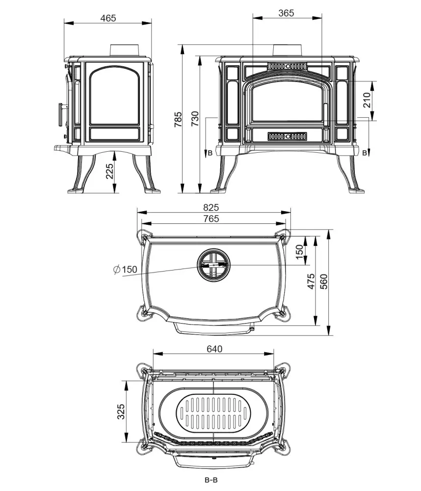 Печь-камин Везувий KZ-14SР "Антрацит" изготовлена из качественного чугуна с толщиной стенки 8-10 мм. Модель рассчитана на обогрев помещений объёмом до 280 м³.Топочная камера с двойными чугунными стенками. В нижней панели предусмотрена колосниковая решётка. Дверь изготовлена из чугуна и оснащена большим панорамным стеклом в виде арки. С двух сторон от двери установлены две стеклянные вставки. На модели KZ-14Р по бокам установлены стекла. Чистота стекла во время работы обеспечивается системой подачи воздуха на внутреннюю сторону стекла. Воздух отсекает дымовые газы и пламя от поверхности стекла, предотвращая закопчение и потемнение стекла. На моделях KZ-14 , KZ-14S ручка управления системой размещена в верхней части передней панели, над дверью у KZ-14Р с боку над стеклом. В нижней части двери размещена ручка задвижки для подачи воздуха на первичное горение
