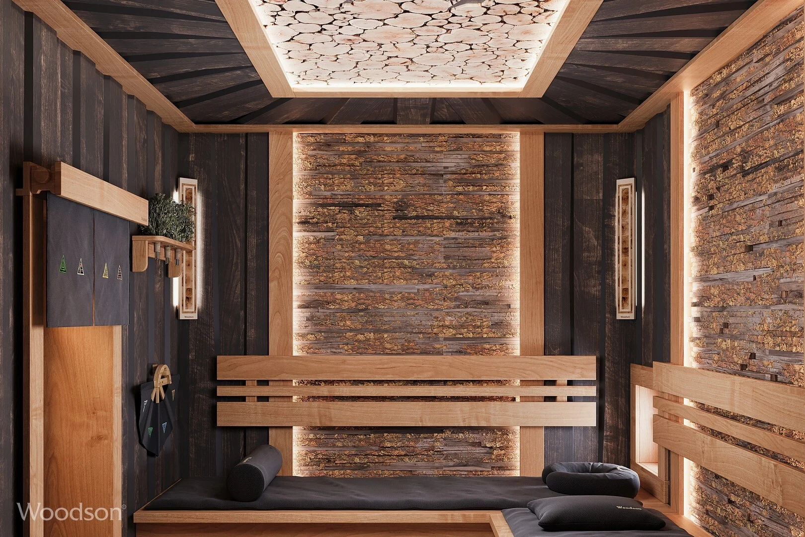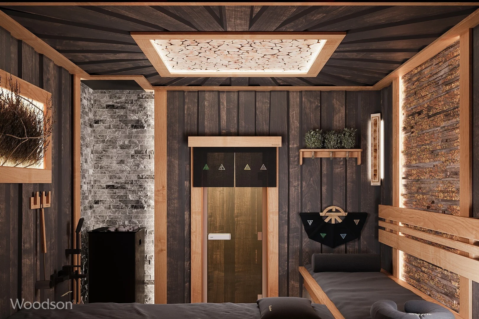 Тёмный стиль бани обеспечит полное погружение в таинство парения. Баня, наполненная паром, ароматами можжевельника, кавказских трав и фруктовых деревьев подарит незабываемые эмоции. Изюминкой данного проекта является потолок в виде солнца с лучами, визуально увеличивая пространство.