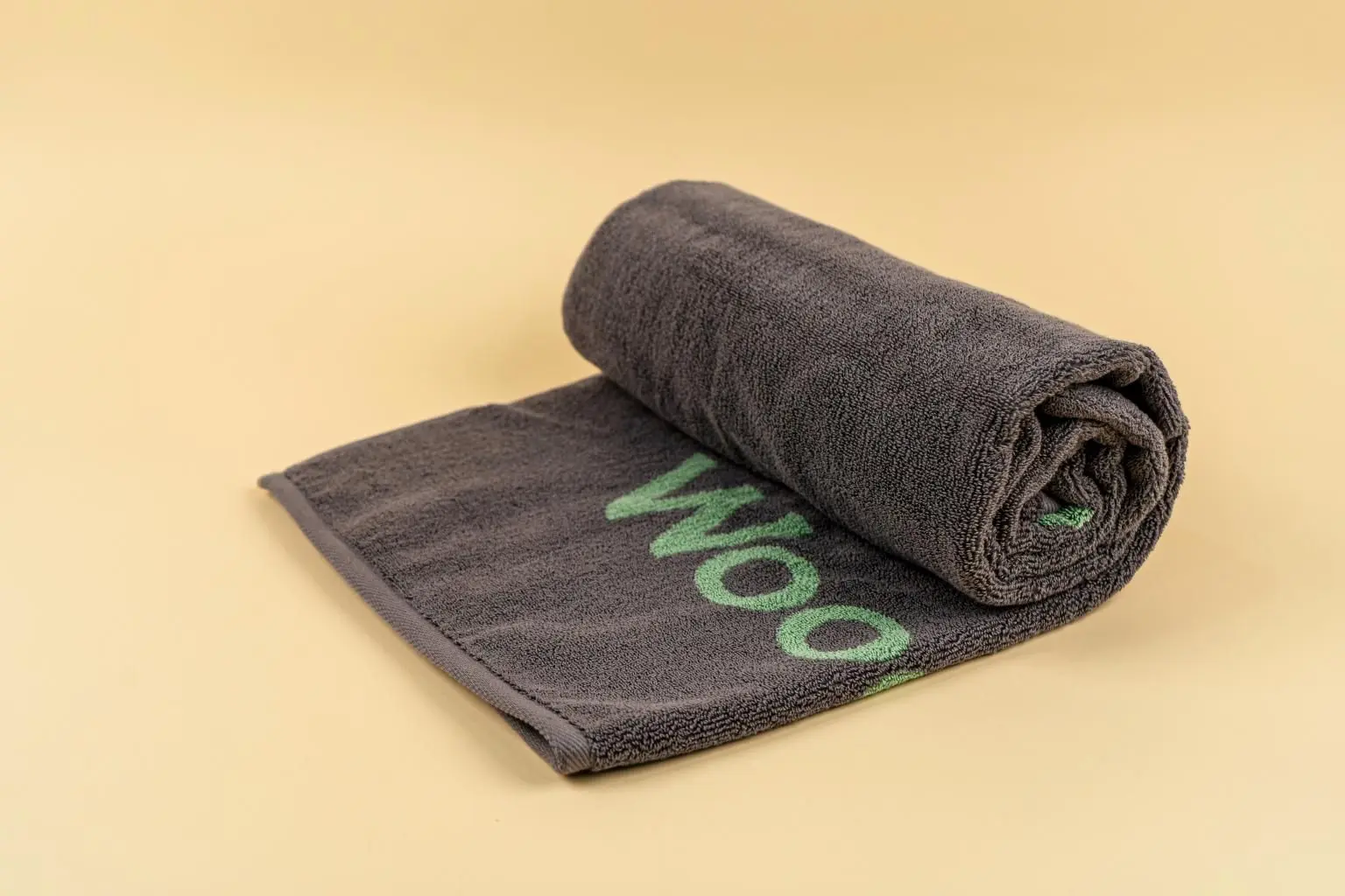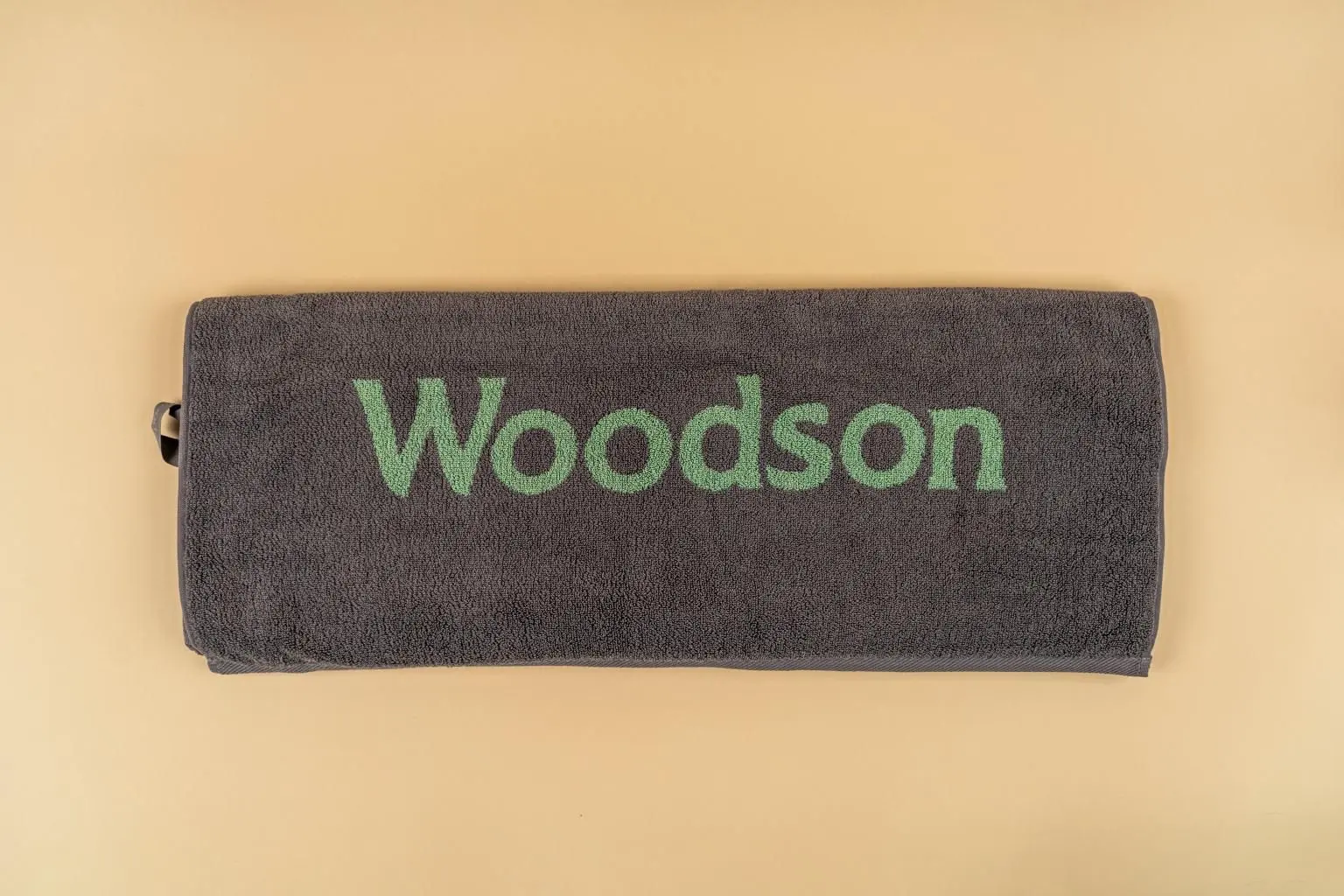 Полотенце махровое размером 70*140 см с логотипом Woodson выполнено в цветовой гамме серый/светло-зелёный.